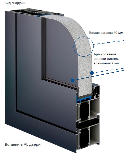 Полиуретановый наполнитель высокой плотности 40 мм обеспечивает теплоизоляцию; вклеенные 2-ные стеклопакеты толщиной заполнения 36 мм с теплосберегающим слоем и аргоном, опционально 2-ной стеклопакет с 2 теплосберегающими слоями и аргоном, толщиной заполнения 40 мм.Безопасность