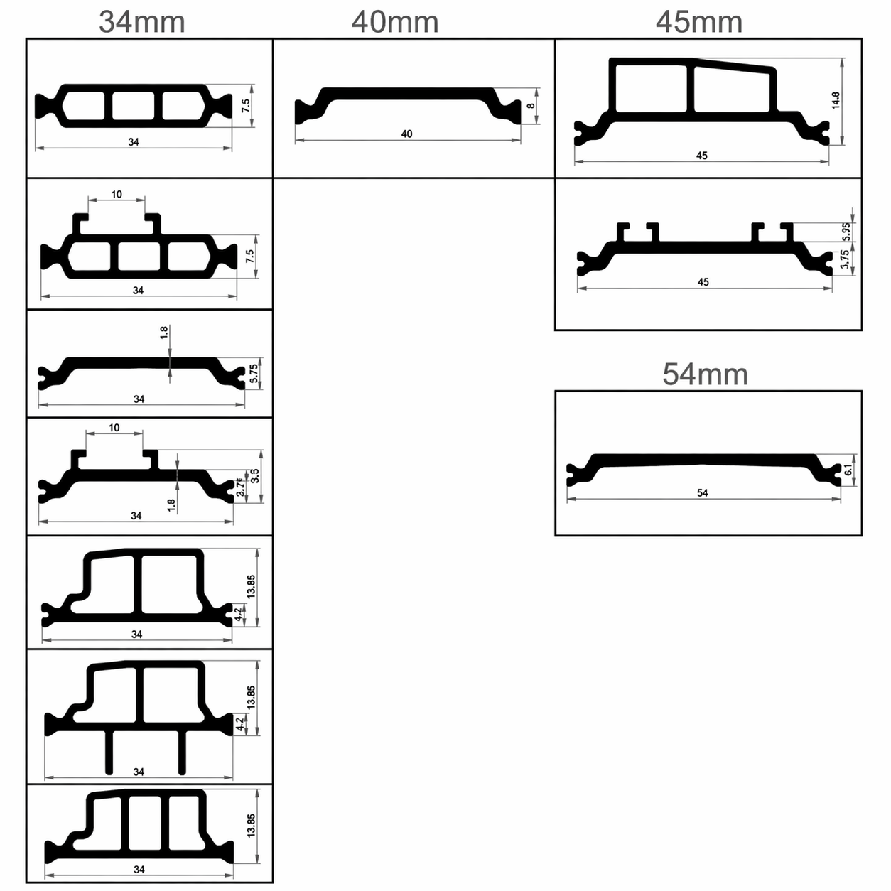 ThermoKontur — полиамидная вставка шириной от 10 до 54 мм, применяемая для снижения теплопроводности алюминиевых систем. Линейка ЕТС ГРУПП включает следующие размеры: 10, 12, 14, 15, 16, 18, 20, 22, 24, 26, 27, 28, 30, 32, 34, 40, 45 и 54 мм. Это более 80 артикулов и модификаций, совместимых с большинством распространённых алюминиевых систем на российском рынке.